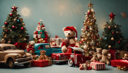 Christmas and New Year holidays background with Christmas tree, gifts and toys.