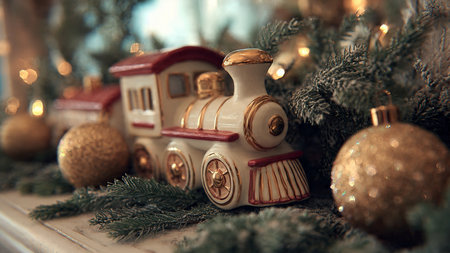 Stylish golden train on modern christmas tree with glitter baubles in window, fairytale decoration. Atmospheric magic time. Christmas festive decor for winter holidays. Merry Christmas!
