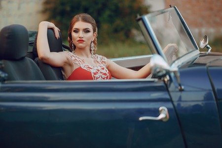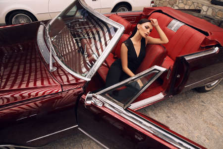 Portrait of beautiful sexy fashion girl model with bright makeup in retro style sitting in vintage car