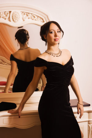Portrait of an attractive young woman in tight black dress in a luxury apartment. Classic vintage interior. Beauty, fashion.