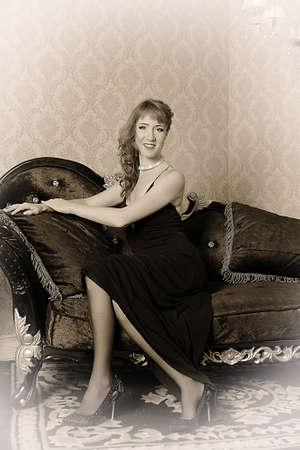Film noir style: gorgeous beautiful young woman lying on a sofa and smoking cigarette