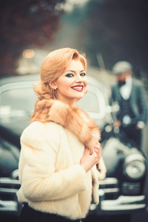 Woman walks on road. Couple in love on romantic date. Retro collection car and auto repair by mechanic driver. Bearded man and sexy woman in fur coat. Travel and business trip or hitch hiking