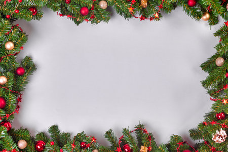 Christmas border template with fir branches, Beautiful red green blue and gold toys and ribbon,on space gray color background, Merry Christmas and Happy New Year.