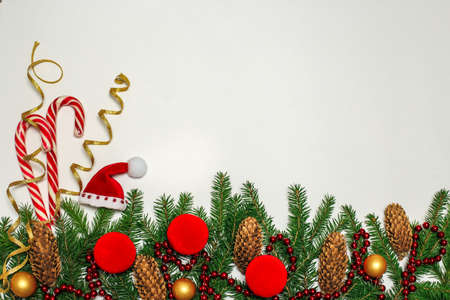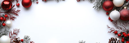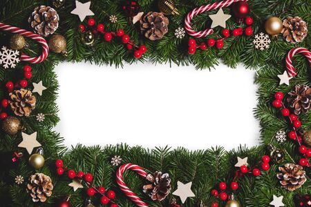 Christmas Border frame of tree branches on white background with copy space isolated, red and white decor, berries, stars, cones