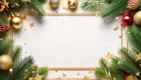 Elegant festive border featuring symmetrical pine needles, shimmering gold stars, and silver baubles framing a clean white background.