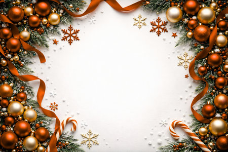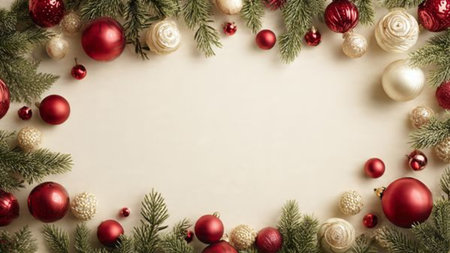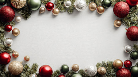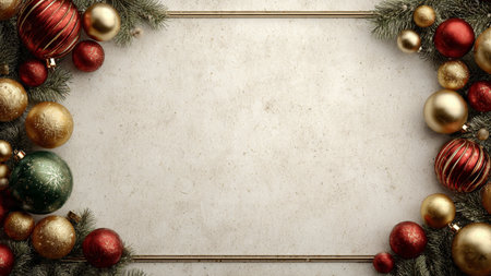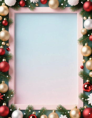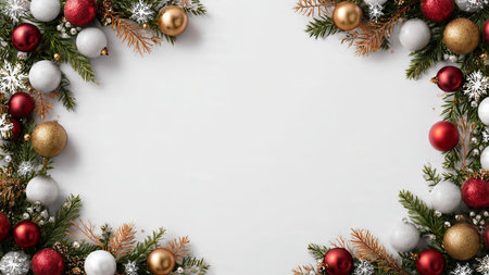 Border-style Christmas composition with ornaments guiding focus toward the empty center space.