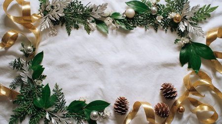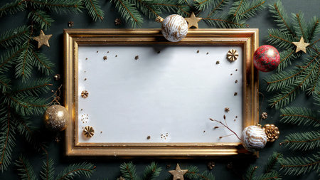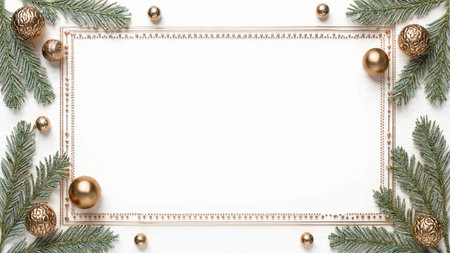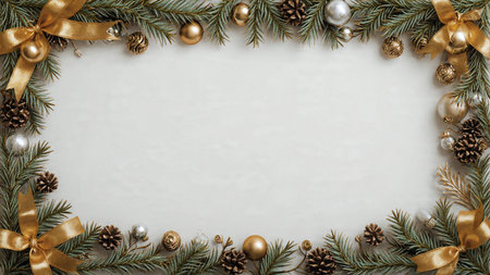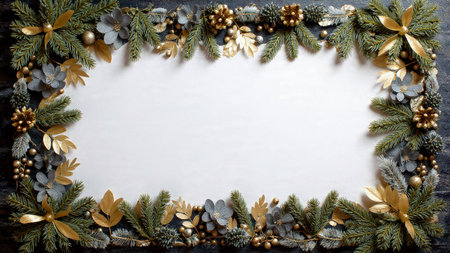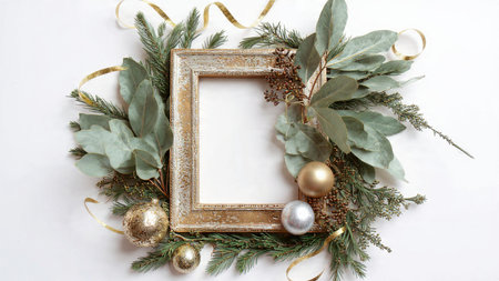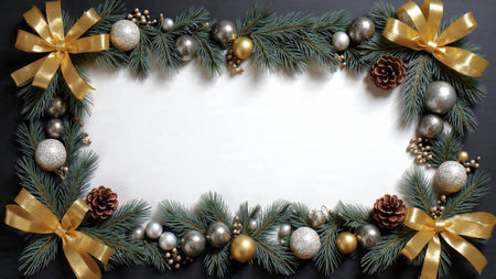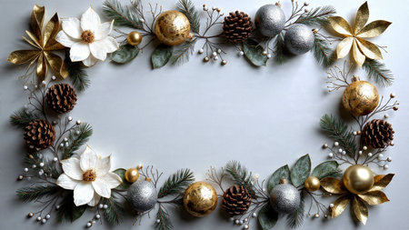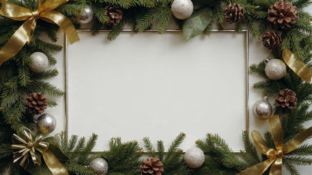 Luxurious Christmas greenery paired with metallic ornaments forming a stunning frame.