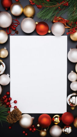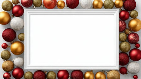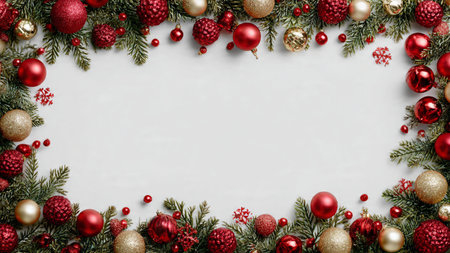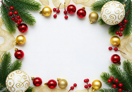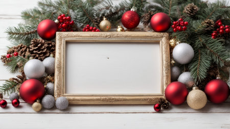 A vibrant frame adorned with red, gold, and white ornaments, surrounded by evergreen branches, perfect for holiday greetings. Ideal for capturing festive memories.