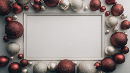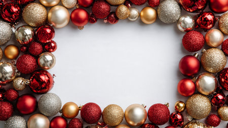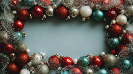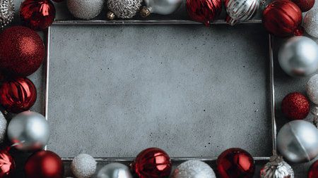 Festive holiday decorations featuring variety of colorful ornaments in red, silver, and blue arranged in decorative frame. scene evokes joyful and cheerful atmosphere perfect for celebrations
