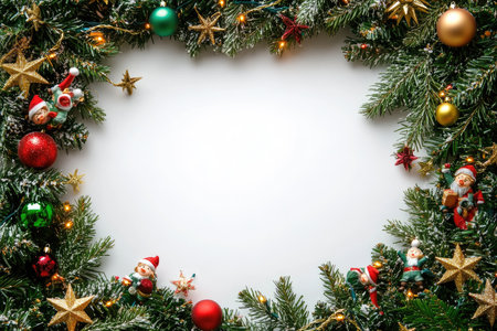 Bright symmetrical border made of green pine and shiny holiday decorations.
