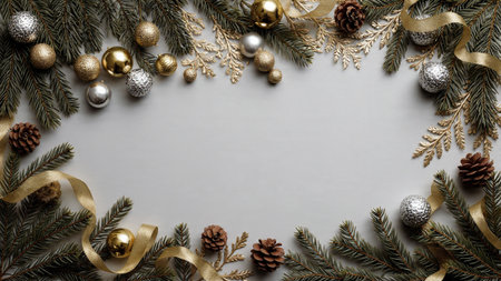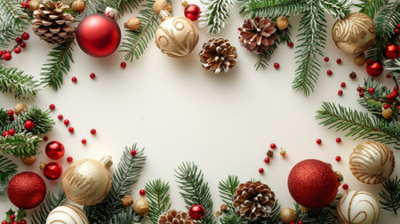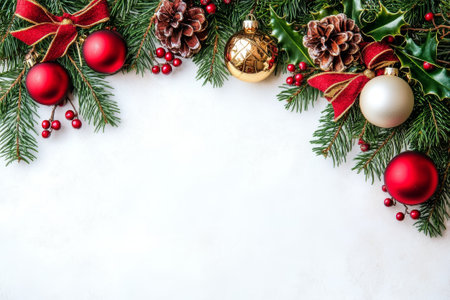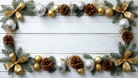 Greenery with ornaments and pine cones frames a blank area perfect for holiday greetings or messages during the festive season.