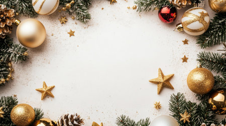 Winter holiday layout with pine needles and delicate shiny decorations forming a frame.
