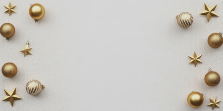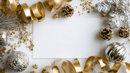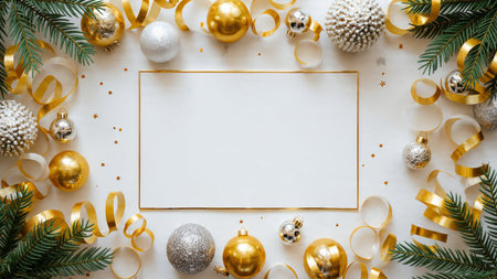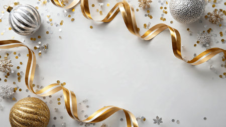 White background featuring gold and silver ornaments, elegant and festive, ideal for holiday celebrations.