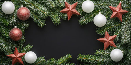 Christmas Border frame of tree branches on black background with copy space , red and wooden decor, berries, stars, cones