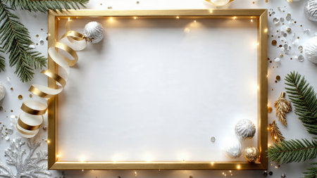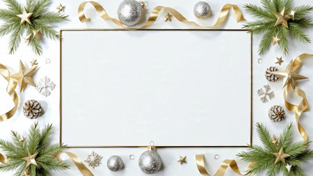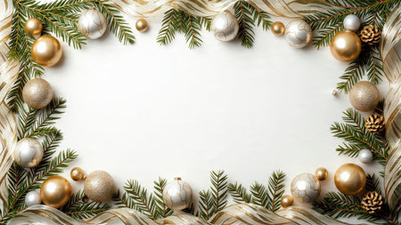 A bright and elegant holiday frame combining pine and glitter ornaments around a white space.