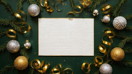 Modern holiday design with deep green pine and reflective metallic decorations along both edges.