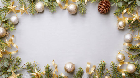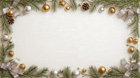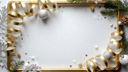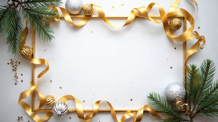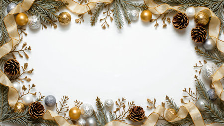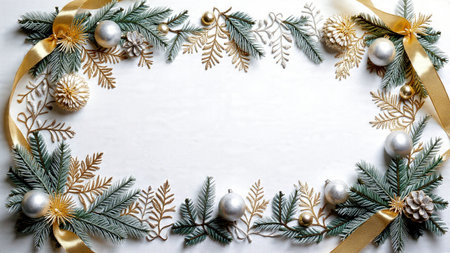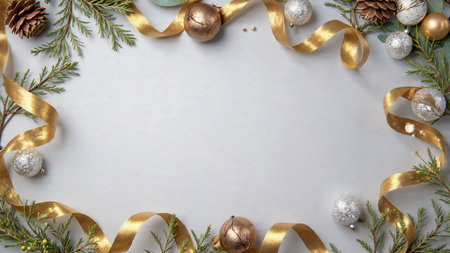 Christmas border with silver glitter ornaments, gold ribbon strips, and green pine arranged along the edges.