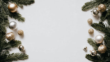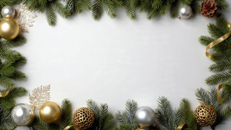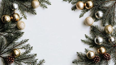 A crisp holiday border with fresh pine branches and bright metallic baubles placed symmetrically on both sides.