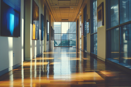 This photo showcases a lengthy hallway adorned with a multitude of windows and various pictures displayed on the walls, Business office corridor filled with artwork, AI Generated