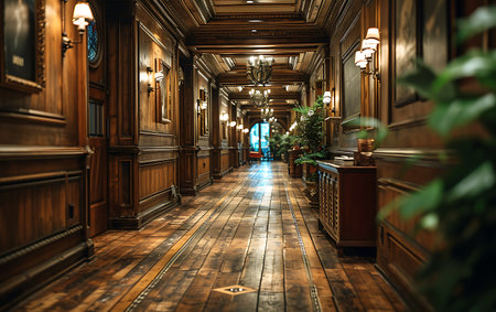 The corridor features polished wooden panels and a marble floor reflecting soft natural light from large windows. The ornate architecture highlights the elegance of the historic building's interior.