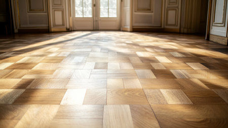 This image showcases an aged wooden floor illuminated by sunlight streaming through windows. The scene presents rich textures and warm tones of the wood, with light and shadows defining the space. Suitable for various projects requiring backgrounds and visual elements, its inviting ambiance is ideal for commercial or editorial applications.