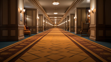 A long hallway with a detailed patterned carpet stretches into the distance. Bright, warm lighting from wall fixtures illuminates the space, creating a sense of depth and symmetry. The image showcases architectural design with its clean lines and repeating elements. Suitable for illustrating concepts of interior design and commercial spaces.