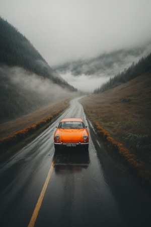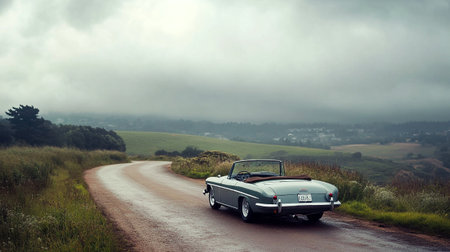 Vintage car on a country road with clouds in the background.
