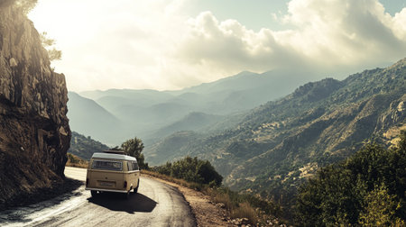 Camper van on the road in the mountains. Adventure and travel concept.