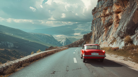 A couple enjoys a leisurely drive through a beautiful valley, surrounded by mountains at sunset.