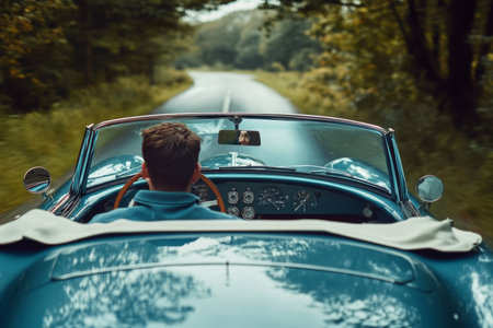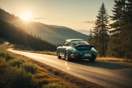 Man is driving old car on local road at sunset, vintage concept
