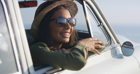 Travel, driver and smile for road trip, woman and fresh air in summer, car and journey for adventure. Window, happy and driving for holiday, shades and transport for tourist, vehicle and person