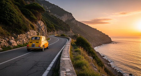 People driving car on sunrise mountain road