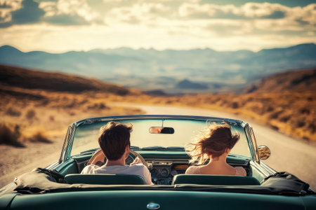 back view couple going road trip. High quality photo