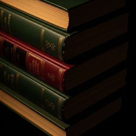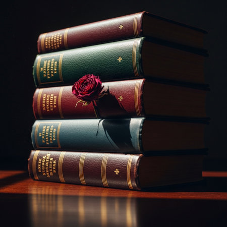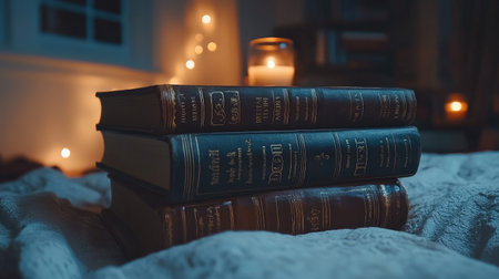 leather bound book spines with embossed titles, shallow focus for moody ambiance