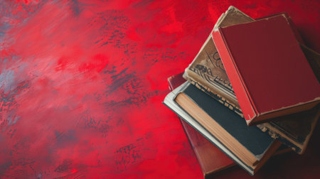 Pile of old, textured books on a red painted background