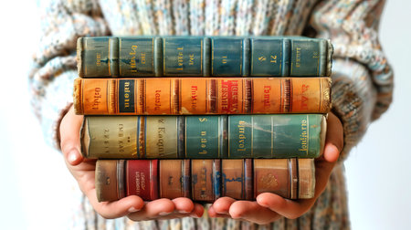 Female Hands holding vintage books against a light background. Arms supports a stack of classic literature. Concept of education, reading, knowledge, and library collection.
