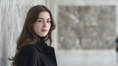 A young woman with long brown hair and blue eyes, wearing a black turtleneck and coat, poses for a portrait in front of a marble wall.