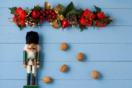 Interesting beautiful Christmas ornaments decorations with nutcracker soldier on blue colored wooden surface texture with copy space.
