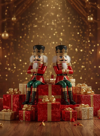 Two festive nutcracker figures standing atop a mountain of wrapped Christmas gifts