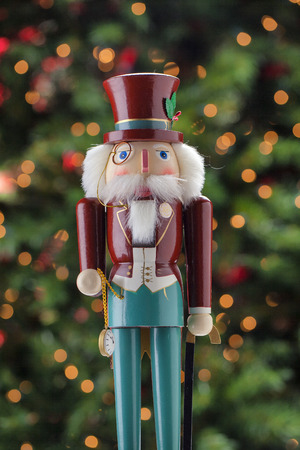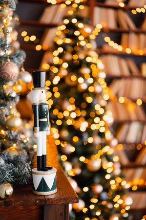 Vertical Photo Handmade Nutcracker Figurine with Illuminated Decorated Christmas Tree in Background and Copy Space