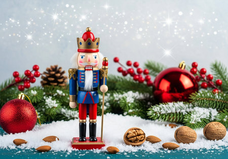 Nutcracker sitting on snow with snowflake background, nutcracker