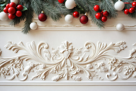 A beautifully arranged display featuring festive ornaments and greenery above an ornate white wall design perfect for the holiday season.