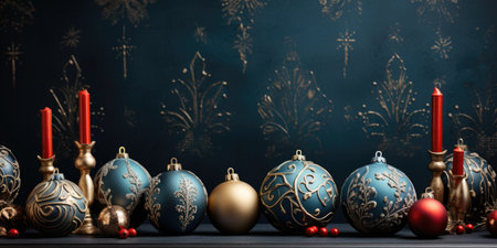 Christmas and New Year background with blue and gold christmas balls, candles and decorations