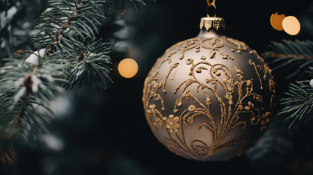 A beautifully designed white christmas ornament featuring elegant golden patterns hangs delicately on a frosted evergreen branch. soft, warm lights twinkle in the background, adding a festive holiday atmosphere. Generative AI