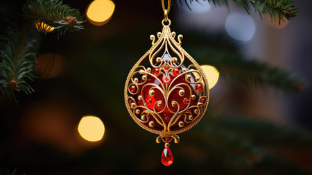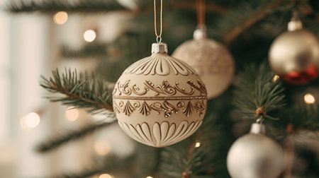 Beautifully decorated Christmas ornament hanging on a tree with soft lights in the background