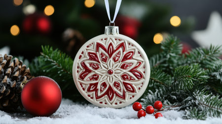 A beautifully crafted red and white Christmas ornament features a snowflake design, elegantly displayed among festive decorations, perfect for holiday spirit.