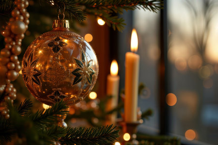 Golden Christmas elegance. An ornate golden bauble on a Christmas tree with glowing candles and lights in the background.