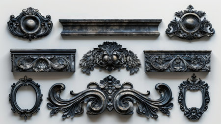 A set of metal decorative elements for furniture. Forged decorative design elements on an isolated white background.