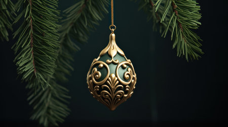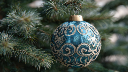 A beautiful blue ornament with intricate gold designs is hanging from a green pine tree branch. This scene captures the festive spirit of the holiday season showcasing seasonal decorations.