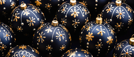Close-up of black christmas baubles with floral ornament.
